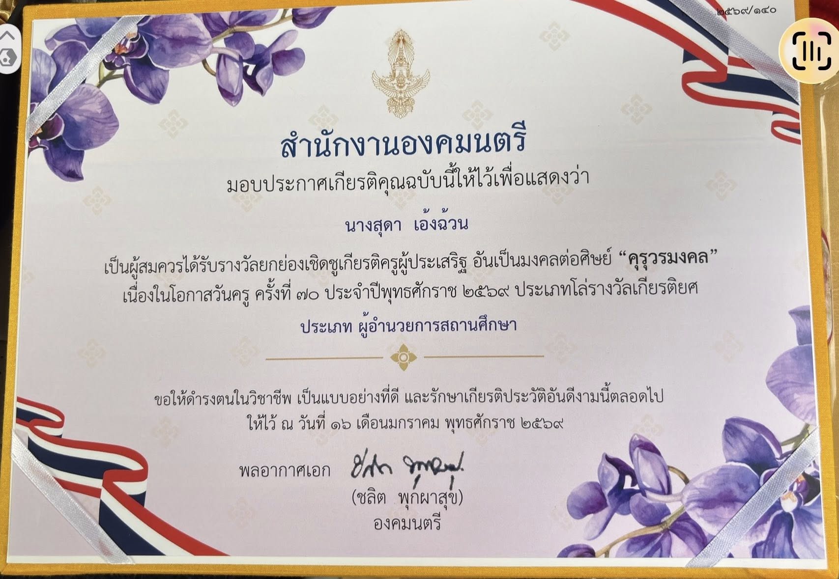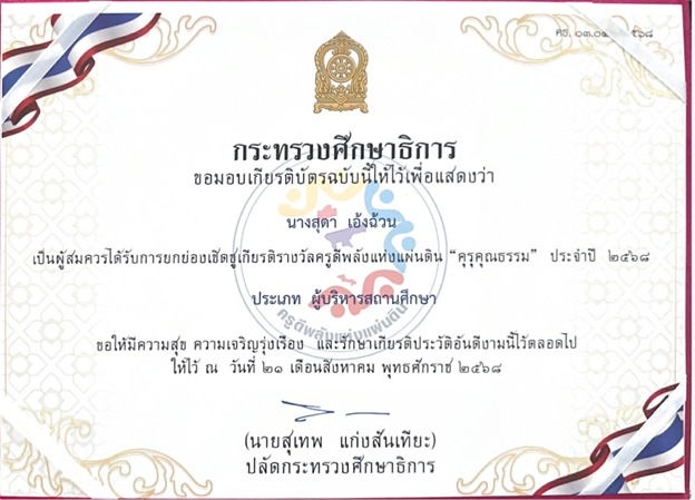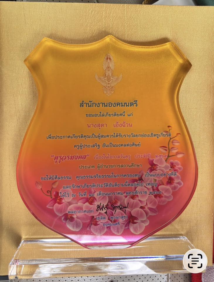 ยกย่องเชิดชูเกียรติ ครูผู้ประเสริฐ อันเป็นมงคลต่อศิษย์ “คุรุวรมงคล” เนื่องในโอกาสวันครู ประจำปี 2569 จากสำนักงานองคมนตรี ลงนามโดย พลอากาศเอกชลิต พุกผาสุข องคมนตรี