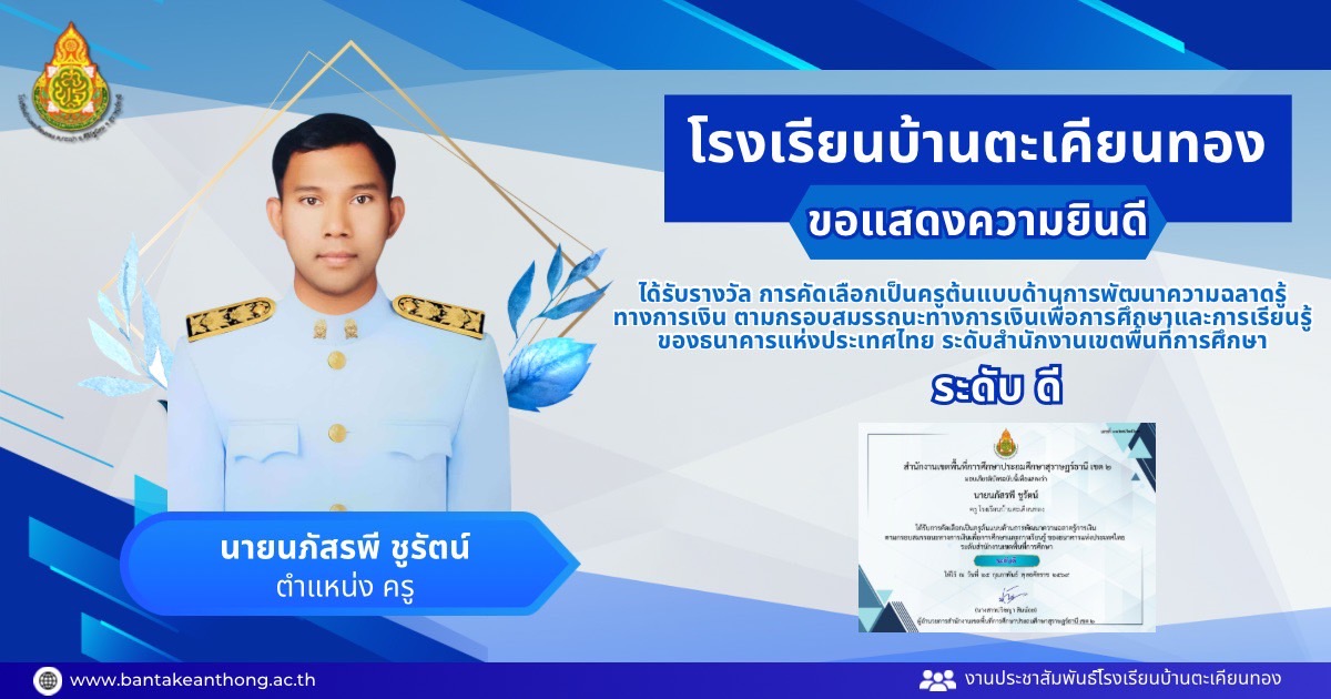 รางวัลการคัดเลือกเป็นครูต้นแบบด้านการพัฒนาความฉลาดรู้ทางการเงิน ตามกรอบสมรรถนะทางการเงินเพื่อการศึกษาและการเรียนรู้ ของธนาคารแห่งประเทศไทย ระดับสำนักงานเขตพื้นที่การศึกษา ระดับดี